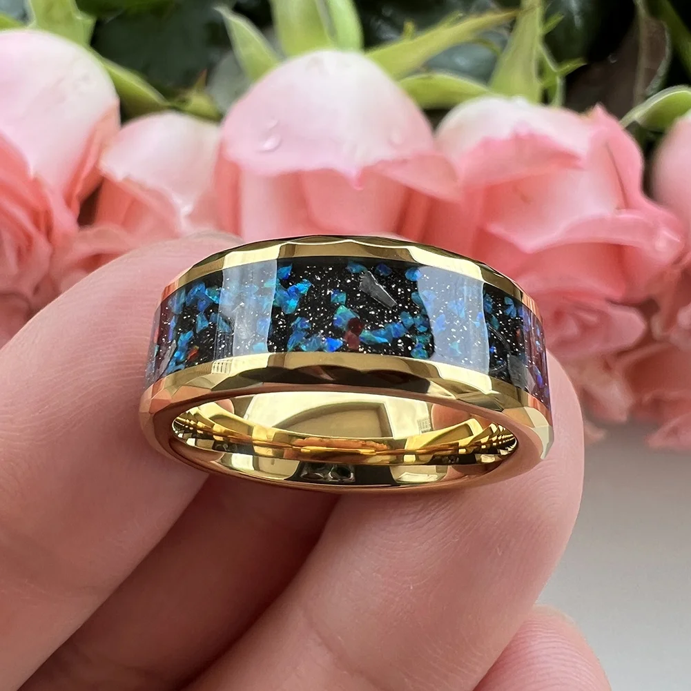 Coolstyle Jewelry 8mm Faceted Mens Fashion Engagement Wedding Band Genuine Meteorite Opal Inlay Gold Tungsten Carbide Rings
